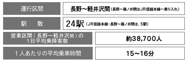 *掲載データは、しなの鉄道株式会社が開示した、平成14年度ベースの篠ノ井〜軽井沢間のものと、平成14年12月4日に長野県とJR東日本が共同で調査したものを参考に算出しています。 |